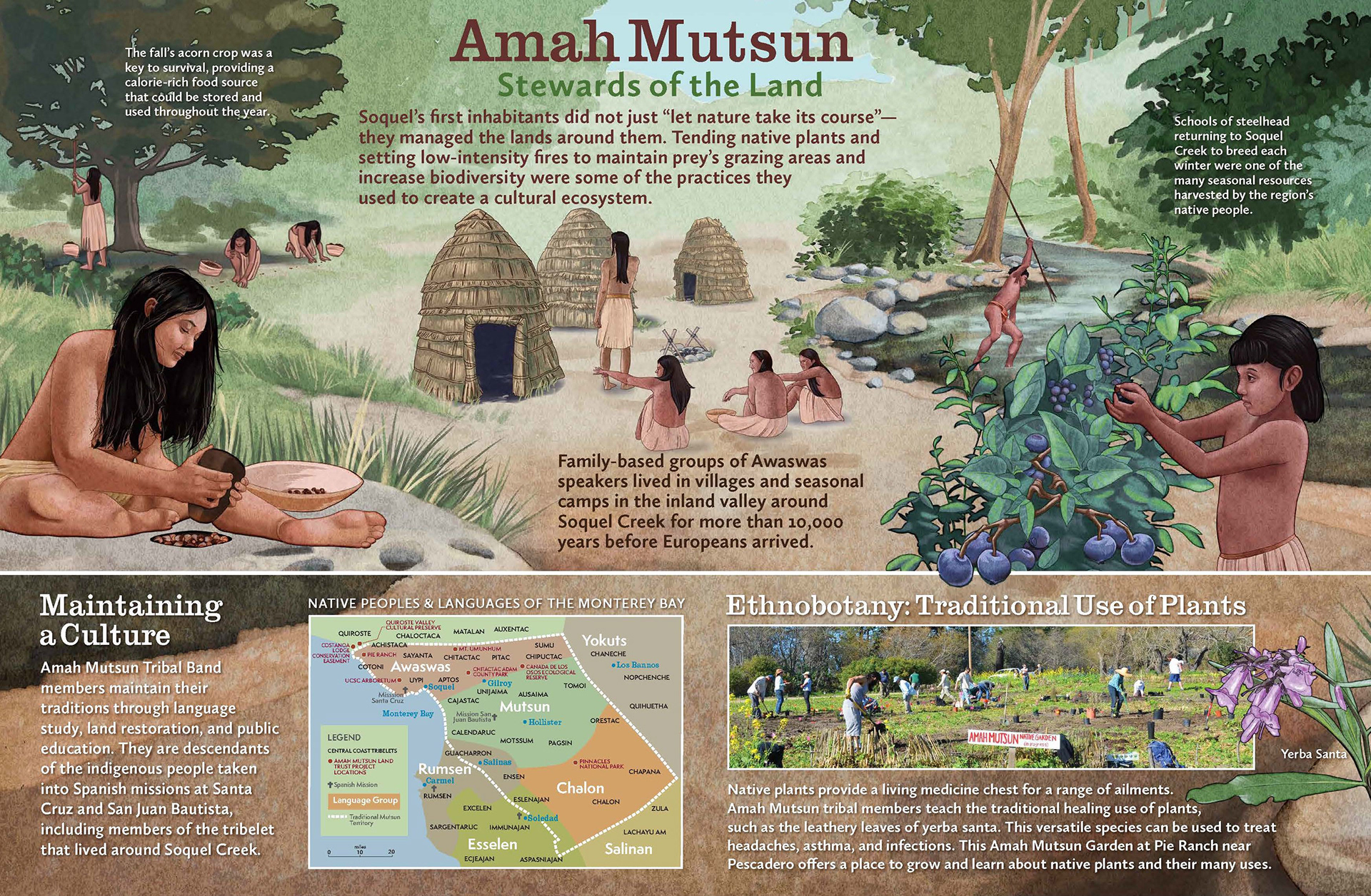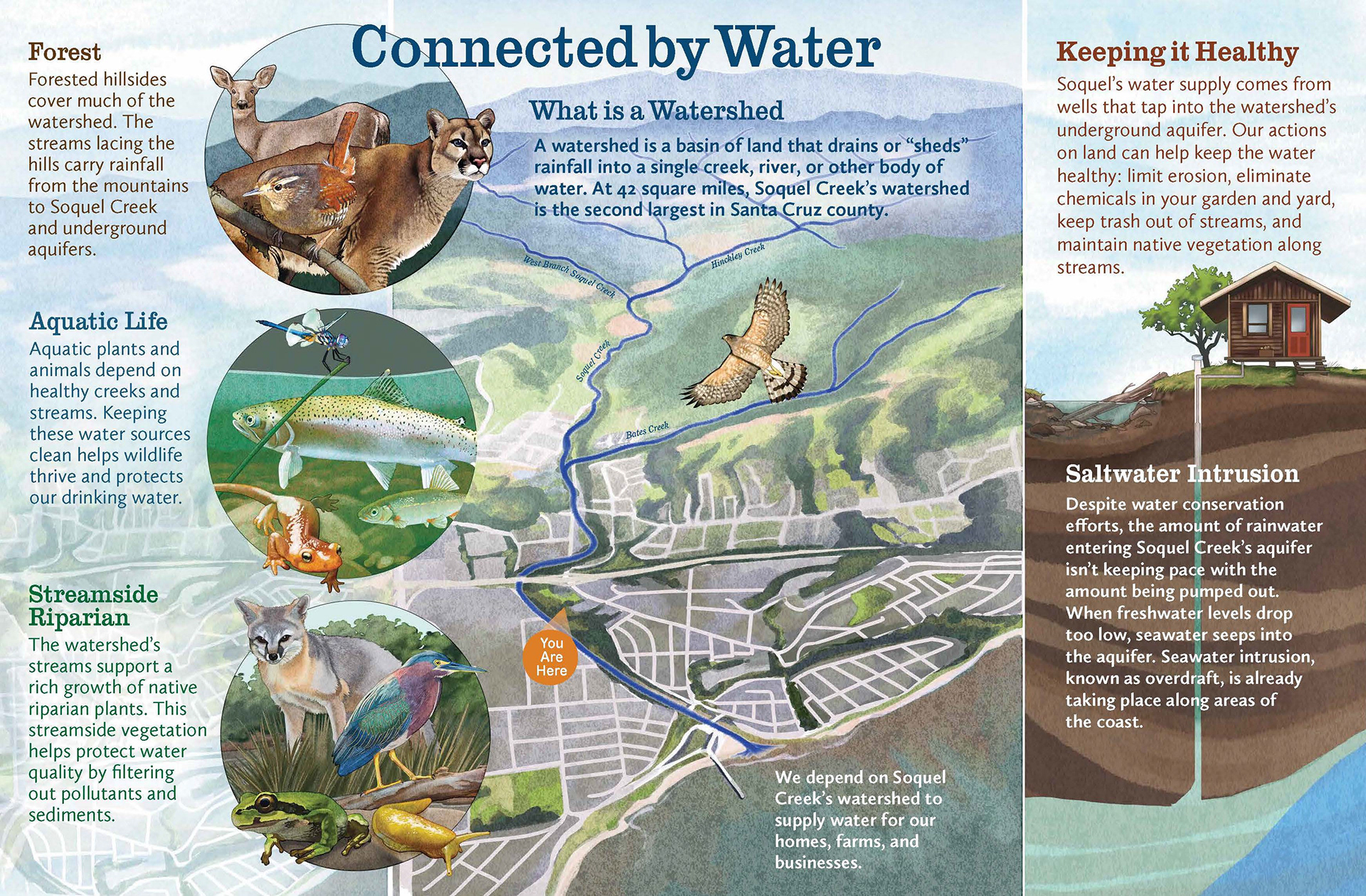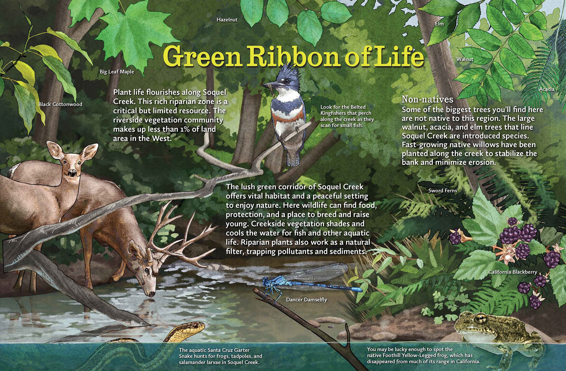 series of interpretive panels in Soquel Creek Park, Capitola, CA. Collaboration with Jane Bolling Design & Studio Abachar, 2020. Illustrated in Photoshop.